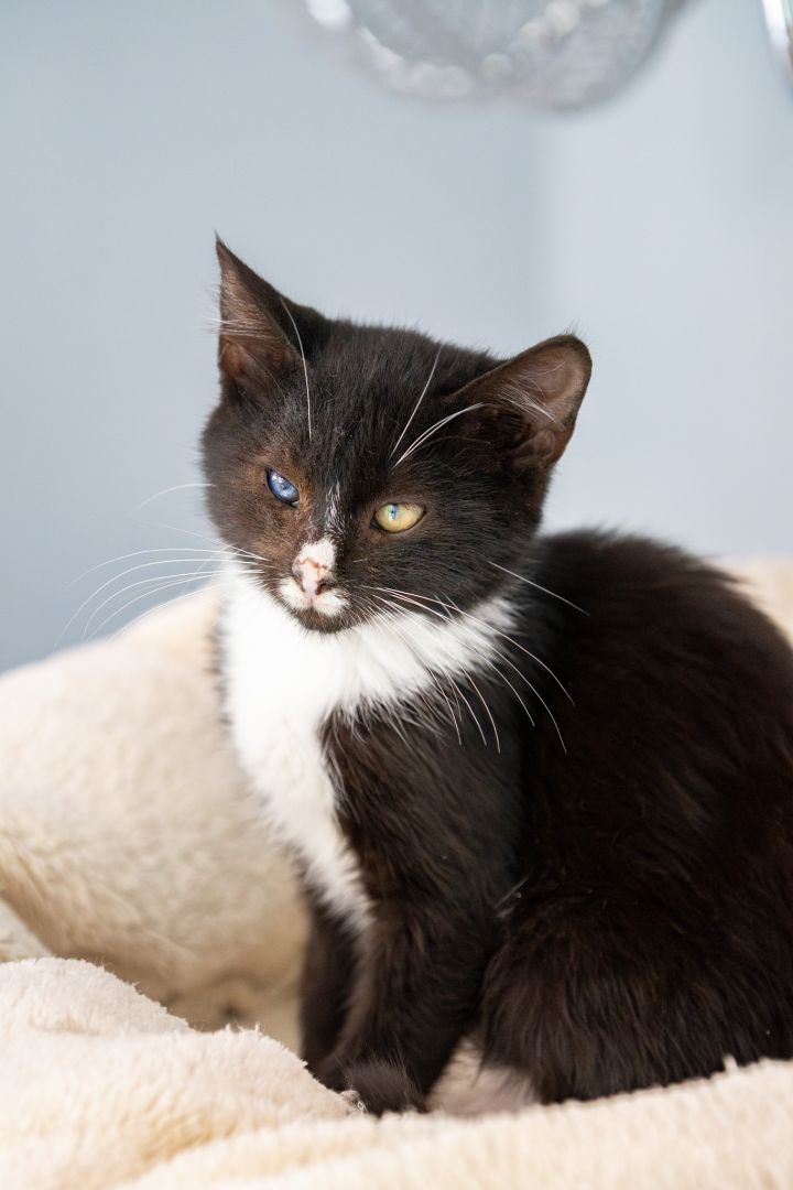 Krokiet - czarny z białym krawatem chłopczyk urodzony w lipcu 2025. Jest przepięknej urody dostojnym kocurkiem. Przeszedł koci katar, który pozbawił go widzenia w jednym oku, drugie jest zdrowe.