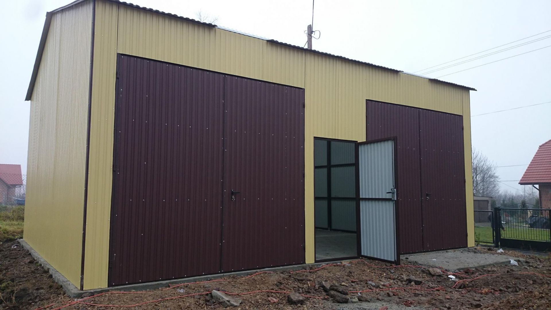 Garaż wyposażony w DWIE bramy otwierane na boki . Bramy w kolorze BRĄZOWYM /możliwość innych kolorów / .